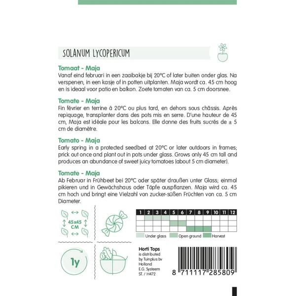 Balkontomaten Maja wordt ca. 45 cm hoog en is ideaal voor terras en balkon. Zoete tomaten van ca. 5 cm doorsnee.