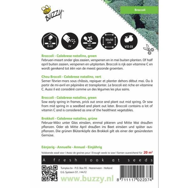 Zaden broccoli zaaien: februari-maart onder glas, verspenen en in mei buiten planten, of vanaf half april buiten zaaien, verspenen en uitplanten. Op de definitieve groeiplek uitplanten als de plantjes ca. 5 weken oud zijn (dus vanaf april tot in augustus). Plantafstand 50 x 40 cm.
