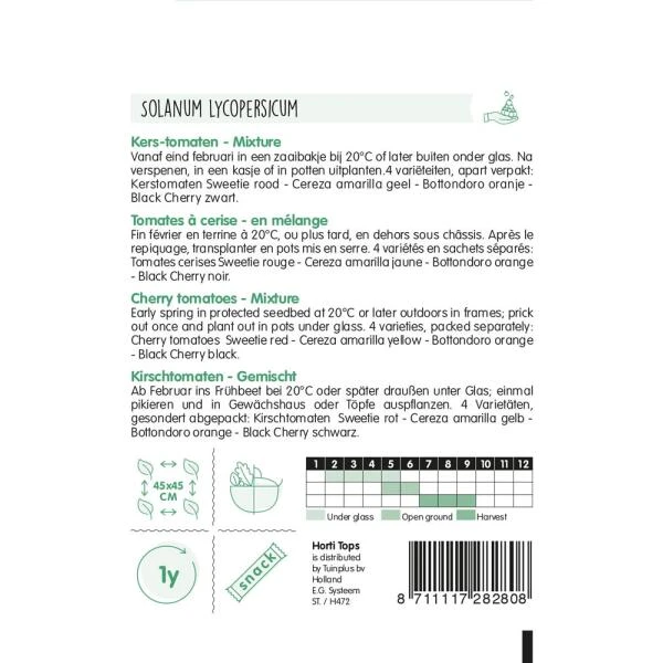 Kerstomaten Mix Cherry, vanaf eind februari in ’n zaaibakje zaaien. Vanaf 20°C of later buiten onder glas zaaien. Na verspenen uitplanten in potten. 4 soorten: Kerstomaten Sweetie rood – Cereza amarilla geel – Bottondoro oranje – Black Cherry zwart.