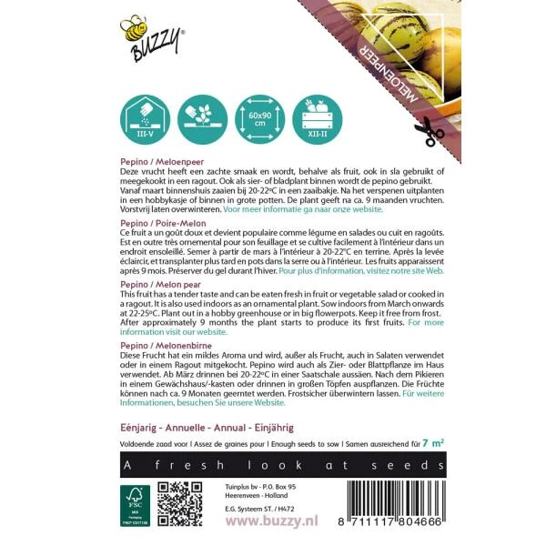Zaden Pepino zaaien: deze vrucht heeft een zachte smaak en wordt, behalve als fruit, ook in sla gebruikt of meegekookt in een ragout. Ook als sier- of bladplant binnen wordt de pepino gebruikt.