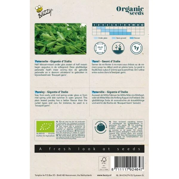 Kweek zelf peterselie op een biologische manier en start met biologische zaden. Peterselie Gigante d’Italia kan gezaaid worden vanaf half februari tot maart onder glas of vanaf half maart tot begin augustus in de volle grond. Het is een gladbladige peterselie die meer aroma geeft dan de gekrulde peterselie en wordt om die reden vaker gebruikt in kruidenbosjes.