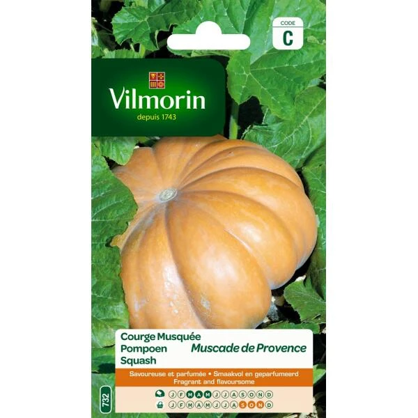 Uitstekende bewaarpompoen Muscade de Provence, bronskleurig bij rijpheid. Oranje vruchtvlees met uitstekende smaak.