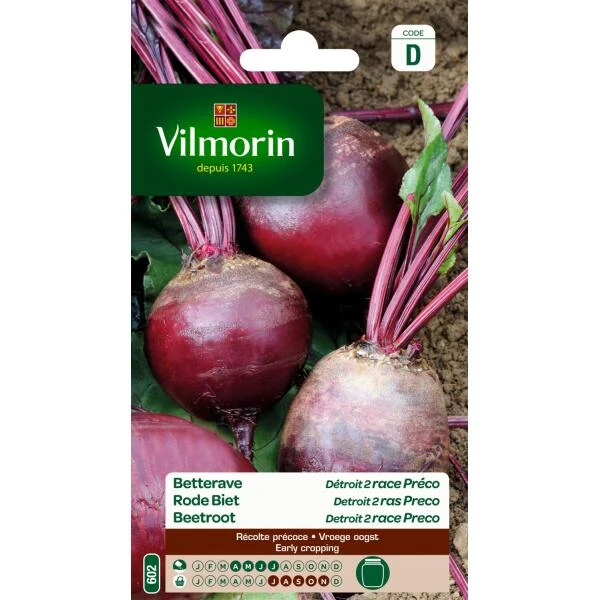 Rode biet Detroit 2 ras Preco, deze variëteit is goed bestand tegen hitte en is opmerkelijk door de hoge kwaliteit van het vruchtvlees: fijne smaak, zachte structuur en mooi donkerrood na het koken.