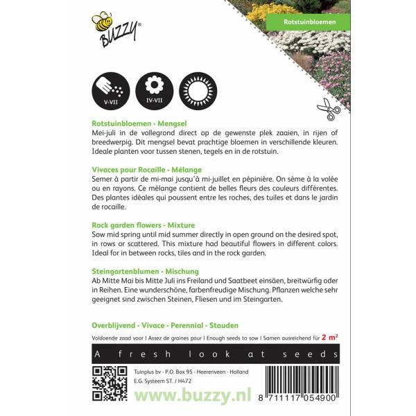 Dit zaadzakje bevat een verrassingspakket van diverse soorten zaad waaruit allerlei planten groeien die perfect in de rotstuin en tussen stenen en tegels willen groeien en bloeien. De groeihoogte varieert van 10-30 cm.