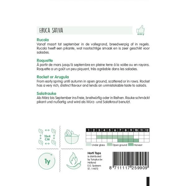 Rucola kan je vanaf maart tot september ter plaatse in volle grond breedwerpig of in regels zaaien. Rucola of raketsla heeft een rijke ietwat pikante notensmaak en is zeer geschikt voor salades.