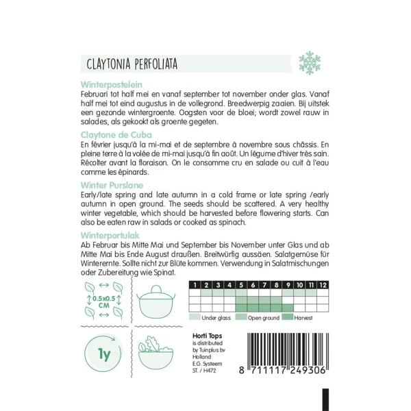 Winterpostelein , onder glas van februari tot half- mei en van september tot november. Vanaf half- mei tot eind augustus in de volle grond. Breedwerpig zaaien. Zeer gezonde wintergroente! Oogsten voor de bloei, kan zowel rauw als gekookt worden vergeten.