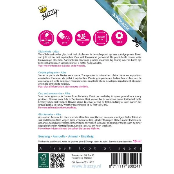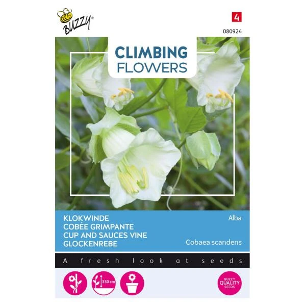 Cobaea wordt ook wel klokwinde genoemd. De plant heeft mooie witte klokvormige bloemen. Aanvankelijk een trage groeier, maar kan bij zonnig weer in een korte tijd zeer snel groeien en uiteindelijk wel 3 meter worden.