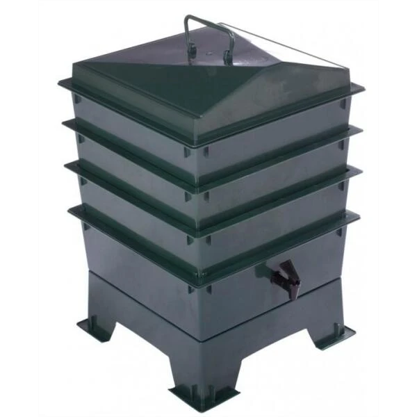 De wormenbak bestaat uit drie stapelbare geperforeerde afvalschalen. Het afval wordt samen met de wormen in de bovenste schaal onder het deksel geplaatst. De wormen zullen het afval in een reukloos enzymatisch proces omzetten tot een voedzaam substraat en compostthee of wormenextract. De drie afvalschalen zorgen ervoor dat je ze onderling kan gaan verwisselen naargelang het materiaal is gecomposteerd zodat er telkens een lege schaal bovenop komt te staan. De wormen migreren vervolgens doorheen de geperforeerde bodem.