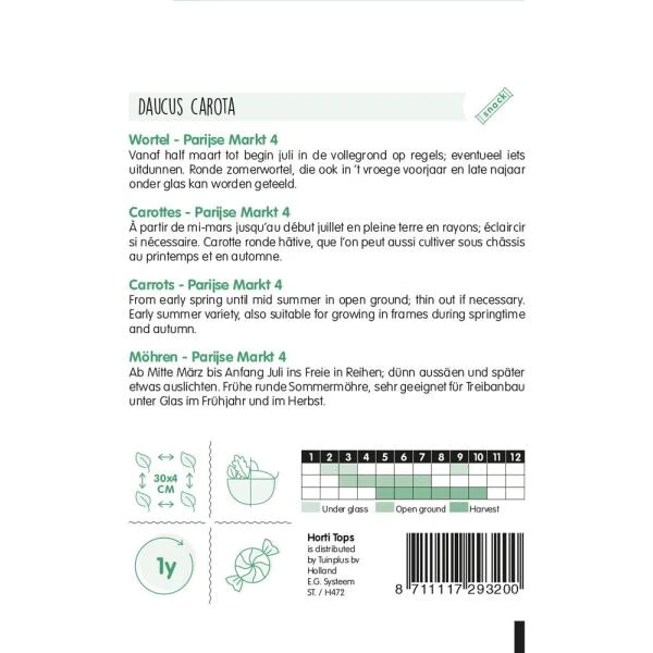 Zomerwortelen Parijse Markt is een rond worteltype dat ook op zwaardere gronden goed voldoet. De worteltjes lijken op grote oranje radijzen. Dit ronde type zomerwortelen wordt bij onze oosterburen met de term ‘Karotten’ aangeduid. Ze zijn heerlijk sappig en zoet en kunnen door de snelle groei al heel vroeg worden geoogst.