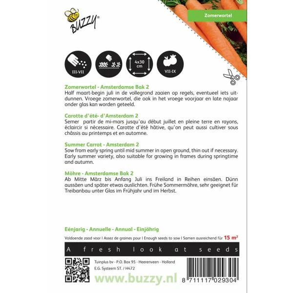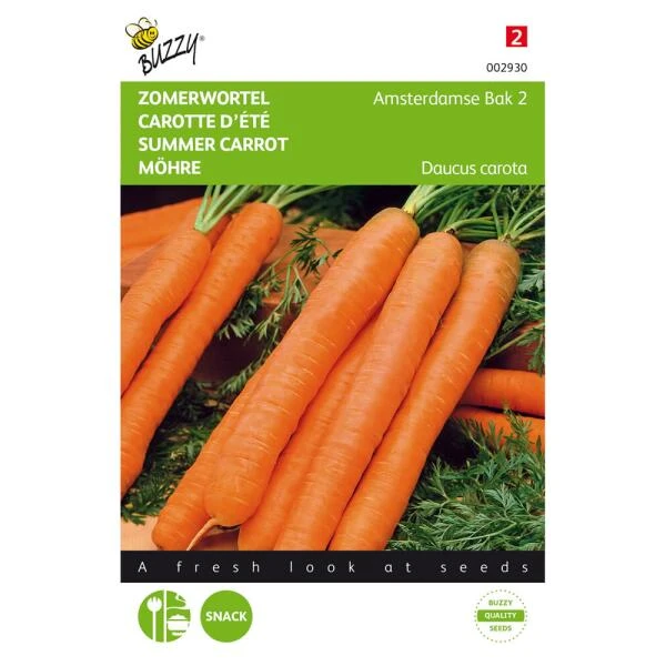 Zomerwortel Amsterdamse Bak 2 is een mooie, dunne cilindrische bospeen met een heerlijke smaak. De wortel dankt zijn naam aan de broeibakken waarin ze vroeger werden gezaaid. De Amsterdamse bak 2 is een vroege zomerwortel en kan reeds in februari worden gezaaid onder glas.