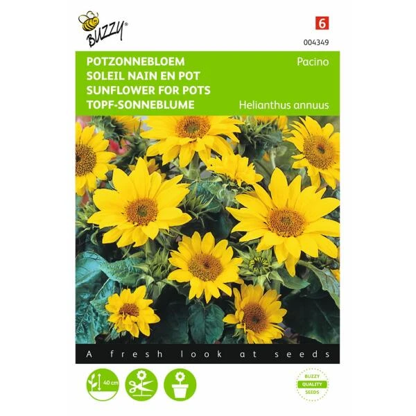 Zonnebloem Pacino is een 35 cm lage, enkelbloemige zonnebloem. Deze soort blijft laag en staat prachtig in borders en perken, maar kan ook uitstekend toegepast worden in grote potten of kuipen.